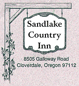 ....Sandlake Country Inn is a secret hideaway, nestled on the awesome Oregon Coast...We invite you to experience the romance and the seclusion of Tillamook County's finest bed and breakfast inn. Tucked into a bower of old roses on 2-plus acres just off the Three Capes Scenic Loop, we're reserved for lovers of privacy and lovers of nature. Maybe you! Cross over this time bridge into a quieter, unhurried world. No pretense here. Your room is fresh and comfortable with flowers, antiques and art treasures. Enjoy breakfast "en suite."